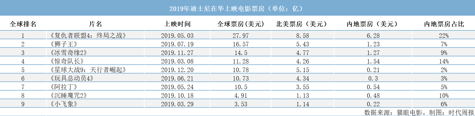 时代周报记者梳理发现,2019年迪士尼共将旗下8部电影作品带入中国市场,包括《复仇者联盟4:终局之战》《狮子王》《冰雪奇缘2》等,以上电影在中国市场累计收获了12.07亿美元票房,在迪士尼2019年实现的百亿美元票房中,占比超一成。